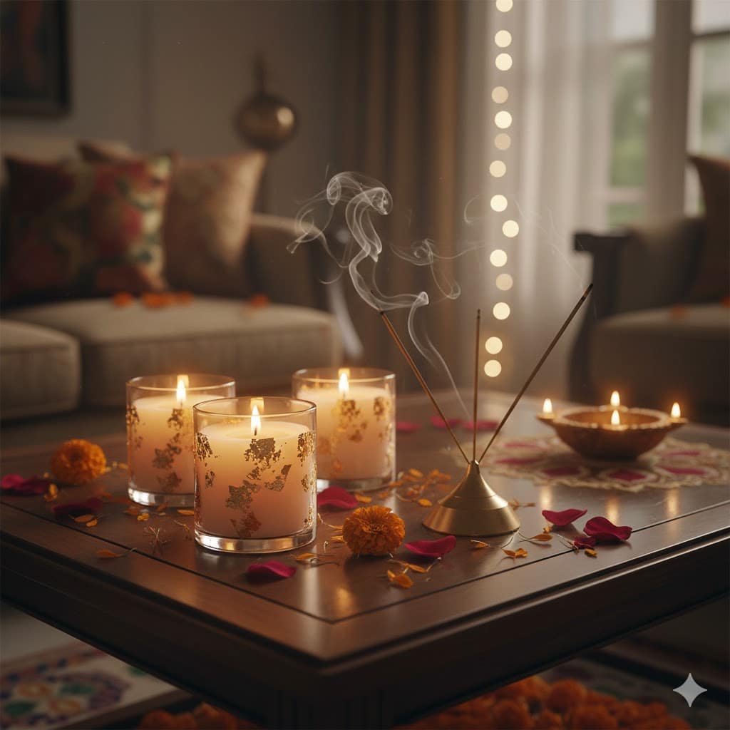 A luxe home isn’t just about looks—it’s about how it feels. Adding scented candles or incense sticks fills your home with warm, festive energy.