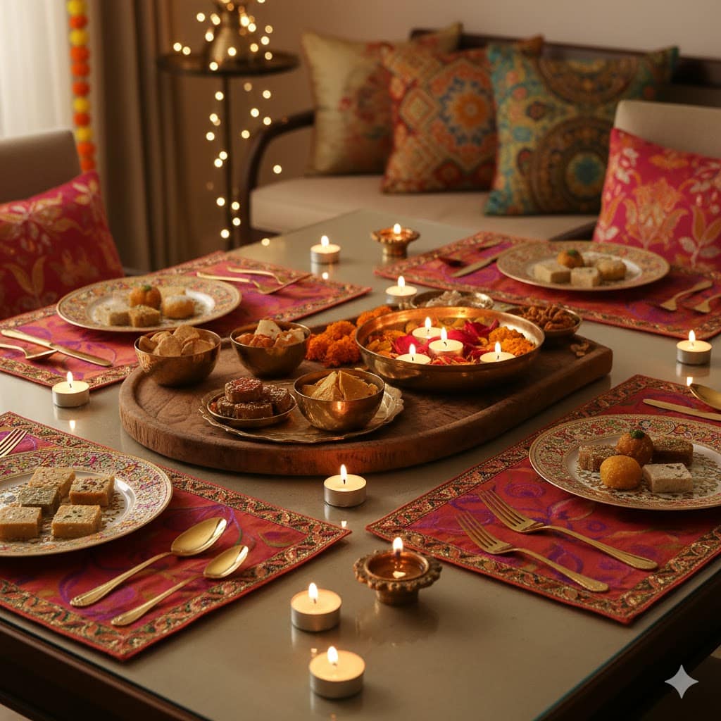 Your Diwali table deserves a glow-up too! Affordable golden cutlery, colourful placemats, and brass or wooden serving trays add an elegant touch without overspending.