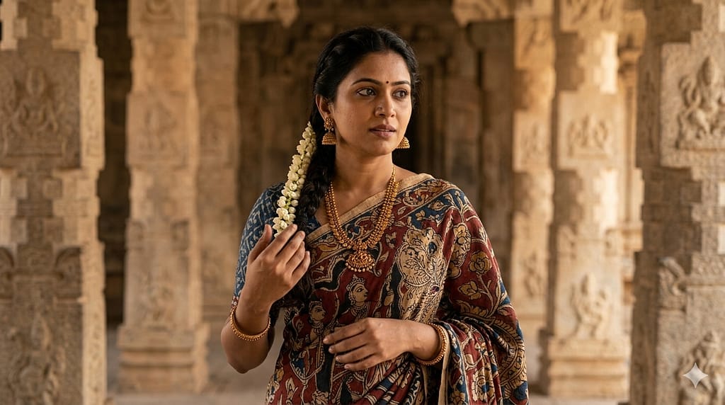 Kalamkari saree styling is genuinely flexible. The same saree can go from a temple visit to a work event to a wedding reception, depending entirely on how you pair it.