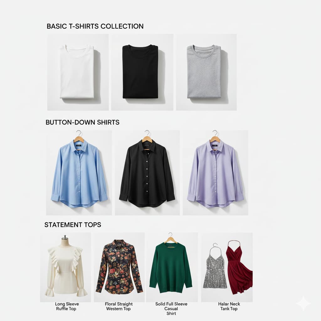Start with versatile tops that mix and match effortlessly. These foundation pieces form the backbone of your wardrobe: