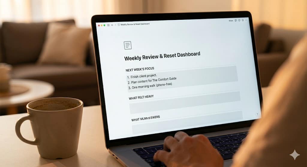 The next section is “Next Week’s Focus.” Three priorities. Not ten. Not “everything.” Three. I write things like “Finish client project,” “Plan content for The Comfort Guide,” “One morning walk without checking my phone.” One of these is work. One is creative. One is personal. That balance alone changed how I approached my week.